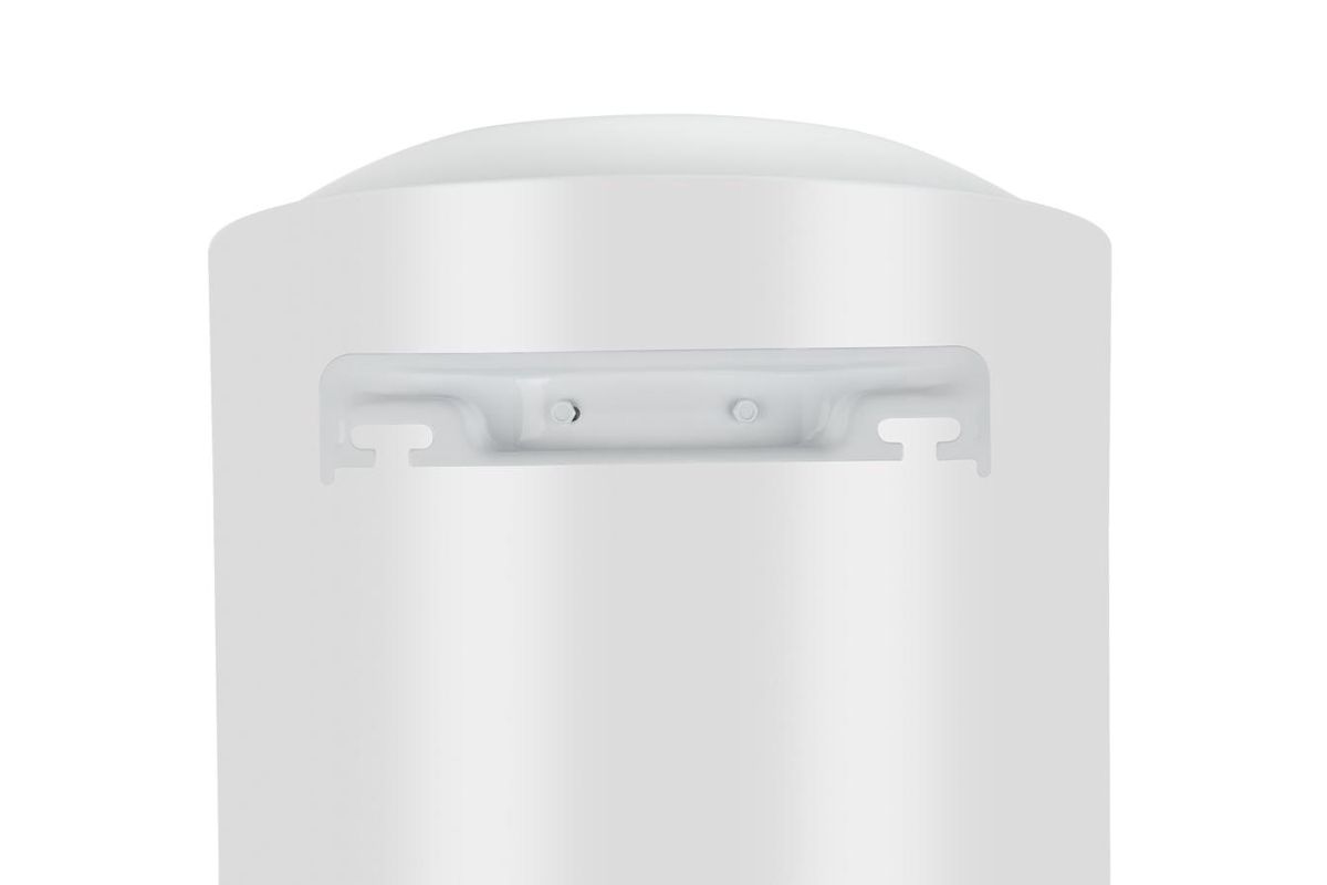 Водонагреватель представлен в виде круглого бака небольших размеров, который легко закрепляется в вертикальном состоянии на стене ванной комнаты.