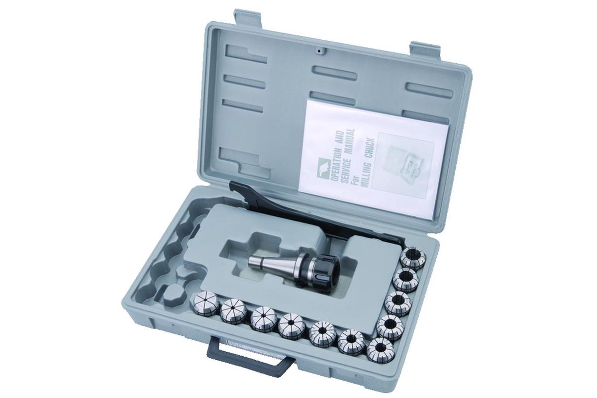 Цанговый патрон с переходными параметрами ISO40/ER32 является элементом основной оснастки, используемой для работы на фрезерно-сверлильных станках, модели JMD-939GH, JVM-836TS, JTM-1050TS, JTM-1230W3 DRO, JMD-26X2 XY DRO, JMD-1452TS DRO и JMC-1448GH. Станочное оборудование этого типа имеет шпиндель с конусом ISO 40, рассчитанного на выполнение работ в сложных режимах. В дополнение к патрону идет набор из 12 цанг марки ER32 различного диаметра в диапазоне 3-20 мм. Цанги предназначены для жесткой фиксации сверлильного и режущего инструмента с цилиндрической хвостовой частью. Патрон устанавливается в шпиндель на конус ISO 40.