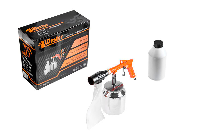 WESTER SSP-10 – пескоструйный пневматический пистолет для обработки поверхностей шлифзерном или песком. Используется для выравнивания, шлифования, удаления ржавчины и старой краски или матирования. Предназначен для работы при температуре от +5 до +35° С и относительной влажности воздуха не выше 80%.