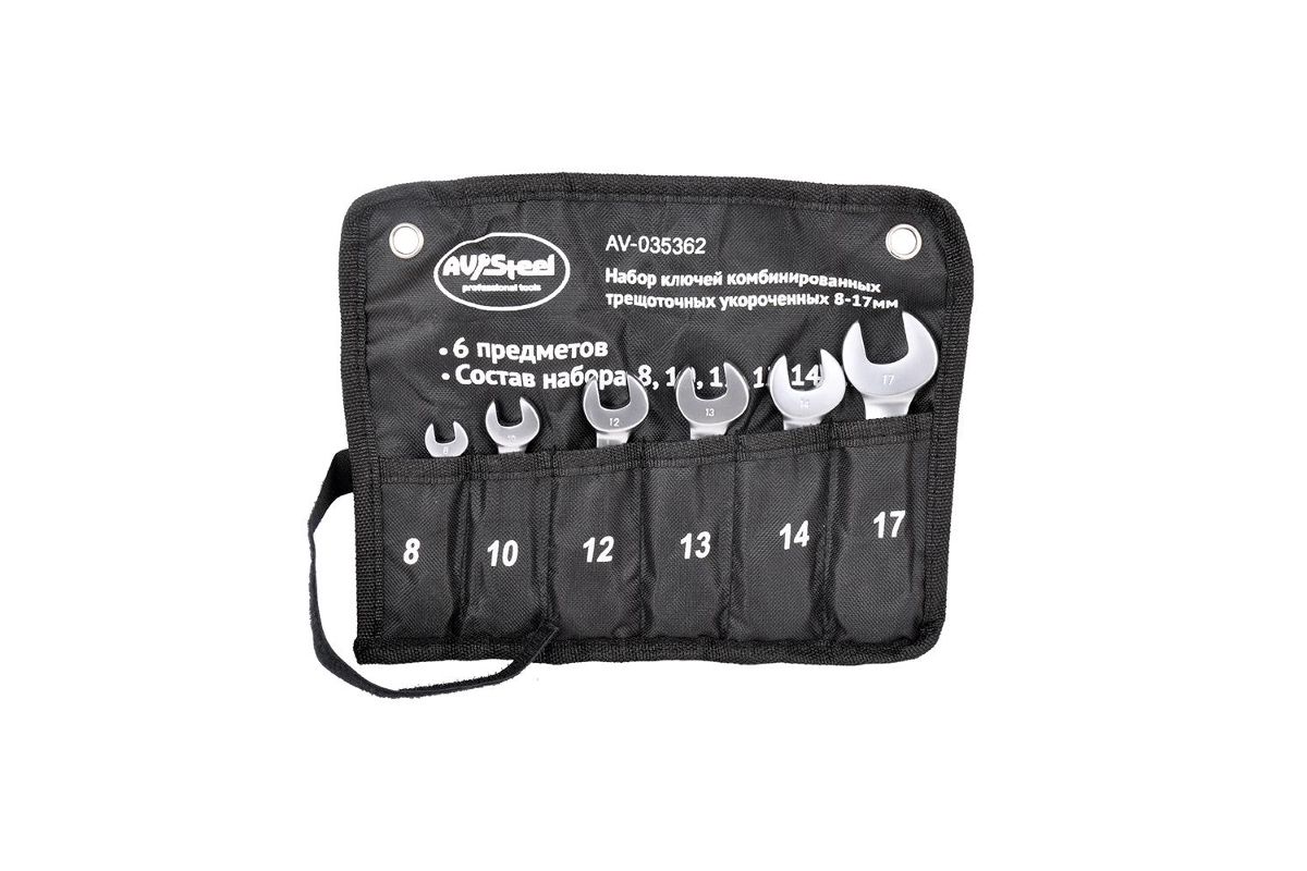 Набор ключей комбинированных трещоточных укороченных используется для откручивания и закручивания болтов и гаек при проведении слесарных и других работ в ограниченном пространстве. В набор входят 6 комбинированных трещеточных укороченных ключей: 8, 10, 12, 13, 14, 17 мм, с сумкой для хранения.